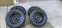 Rozsda mentes felújított lemezfelni garnitúra. 2 szezont futott felújítás óta azt is nyáron. Fazonra nem egyformák, kettőn ovális lukak vannak másik kettőn meg kör alakúak de méretre megegyeznek. Képeken látható! Érdemes tengelyenként felrakni az egyformákat. A rajta lévő gumi nem árképző 12 évnél öregebb.